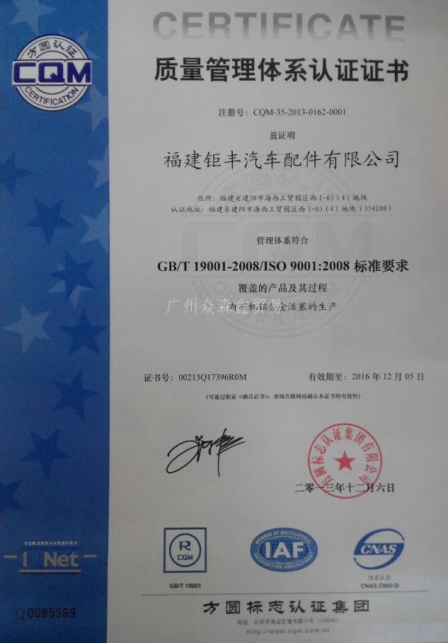 广州焱森鑫公司授权福建钜丰汽车配件有限公司为我方客户代加工生产铝合金活塞。本证书为授权方厂家资质认证。